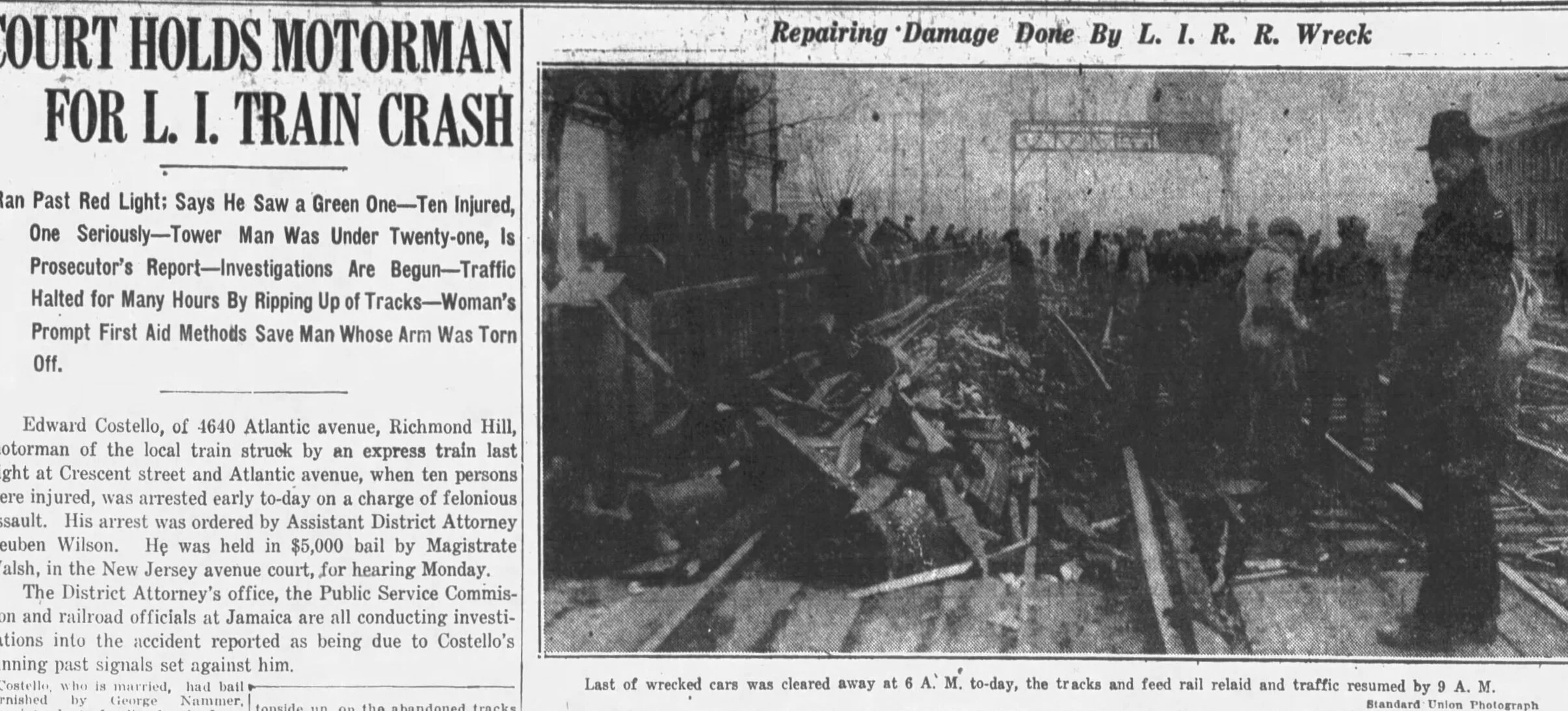 One hundred years ago today … At 9:35 pm, two Long Island Railroad trains collided at Atlantic Avenue and Crescent Street, Brooklyn, close to the Queens border. More than 50 people were injured.