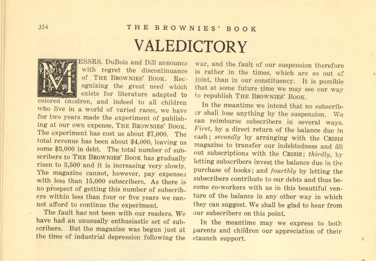 This is the last Brownies' Book. For twenty-four months we have brought Joy and Knowledge to four thousand Brownies stretched from Oregon to Florida. But there are two million Brownies in the United States, and unless we got at least one in every hundred to read our pages and help pay printing, we knew we must at last cease to be. And now the month has come to say goodbye. We are sorry---much sorrier than any of you, for it has all been such fun. After all --- who knows --- perhaps we shall meet again.