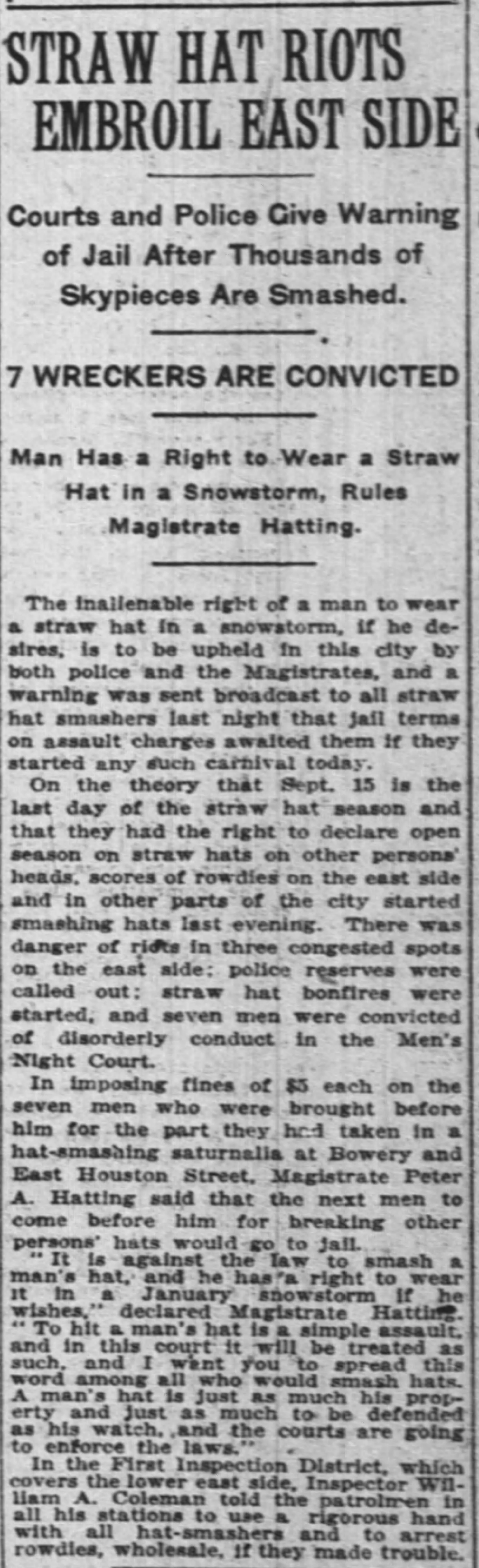 One hundred years ago today … So-called riots erupted over straw hats, as young New Yorkers enjoyed enforcing the traditional end of straw hat wearing-season.